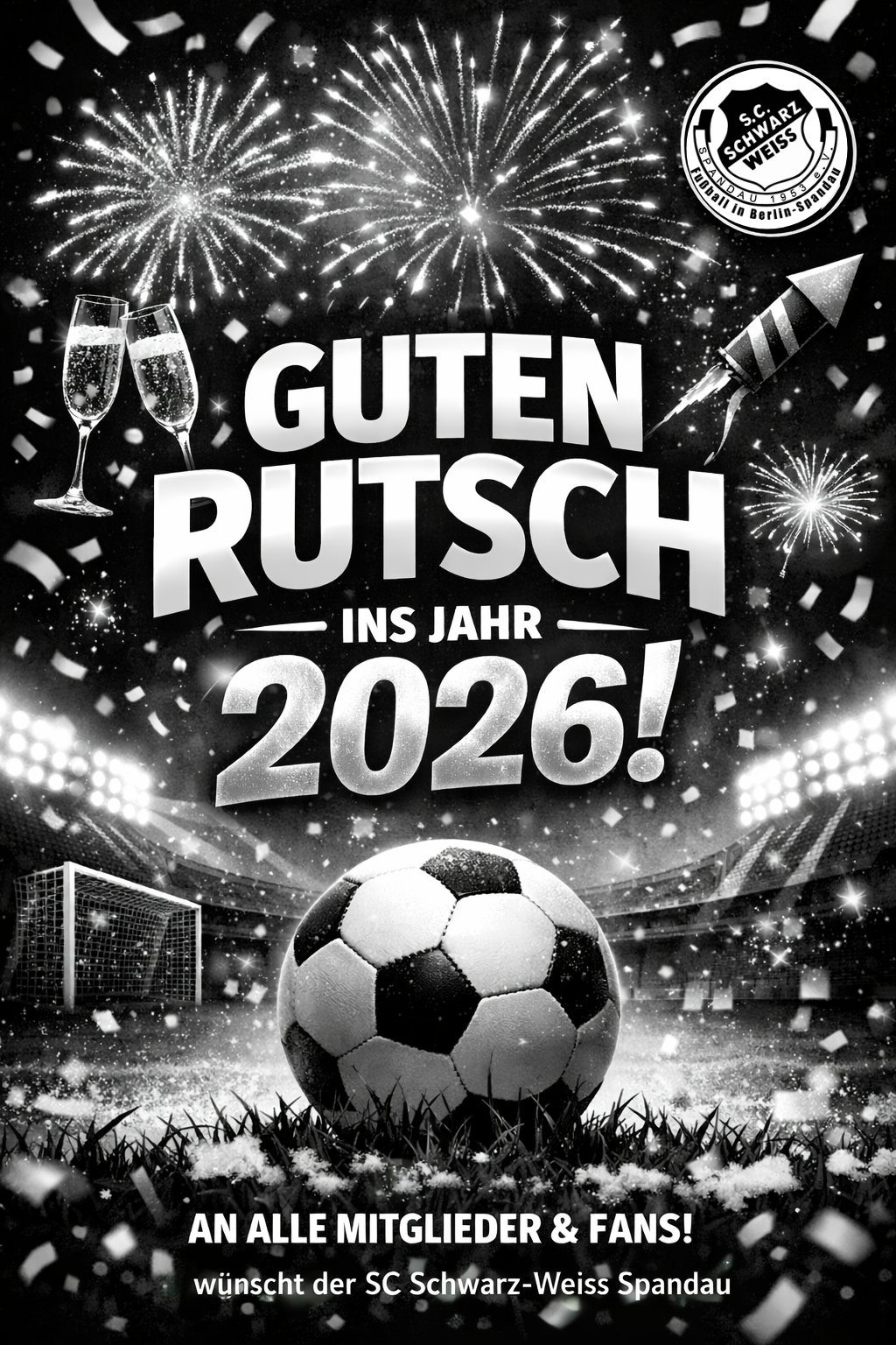 Wir wünschen allen Mitgliedern, Spielern, Fans und Followern vom SC Schwarz-Weiss Spandau einen guten Rutsch ins neue Jahr und bedanken uns für all den Support, den Ihr uns 2025 habt zukommen lassen.