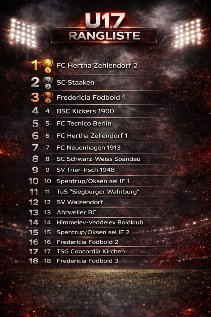 Insgesamt konnte sich das Team von 18 Mannschaften den 8. Platz sichern und sich wirklich spannenden Herausforderungen stellen. Unter anderem hatten sie die Gelegenheit sich gleich an zwei Verbandsligisten (Hertha 03 und SC Staaken) und einem Landesligisten (Hertha 03) zu testen und konnten sich wirklich gut präsentieren. Auch war es schön gegen Teams anzutreten, die man sonst so nicht auf dem Platz als Gegner hat. So trafen unsere Jungs unter anderem auf den FC Neuenhagen, FV Trier-Irsch und das dänische Team FC Fredericia Fodbold.